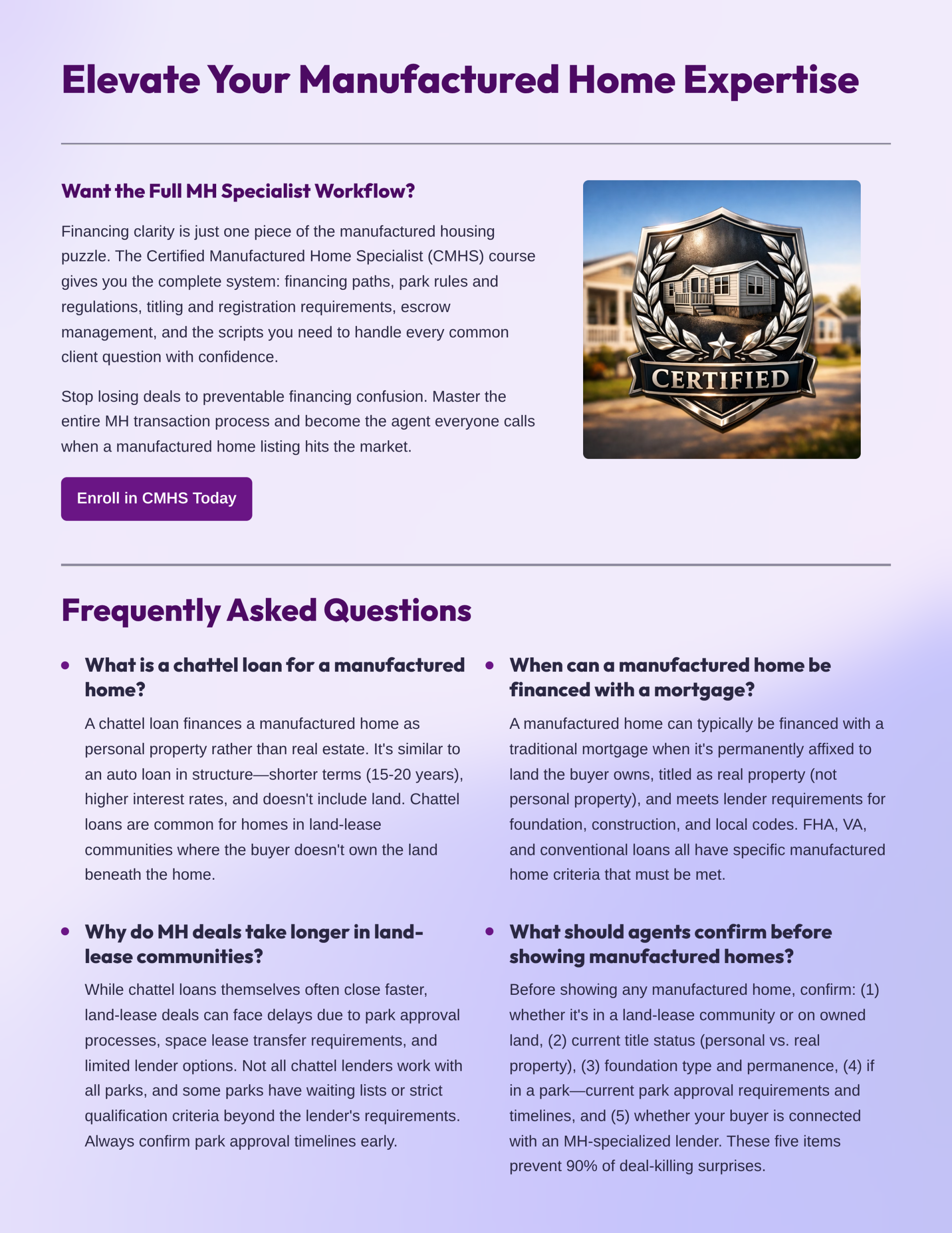 As a new real estate or sales agent venturing into the world of manufactured homes, understanding financing options is crucial for your success. Our comprehensive guide on Chattel vs. Mortgage financing will equip you with essential knowledge that can significantly impact your client's homeownership experience. This free resource is designed to empower you to make informed decisions and provide valuable insights to your clients. Don't miss the opportunity to enhance your expertise in this niche market—download the guide now and take the first step towards becoming a trusted advisor in manufactured home sales!
